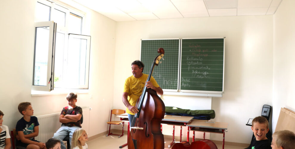 Im Herbst hatten die Kinder im Zuge des Musikunterrichts die Möglichkeit mit einem Kontrabass zu spielen.